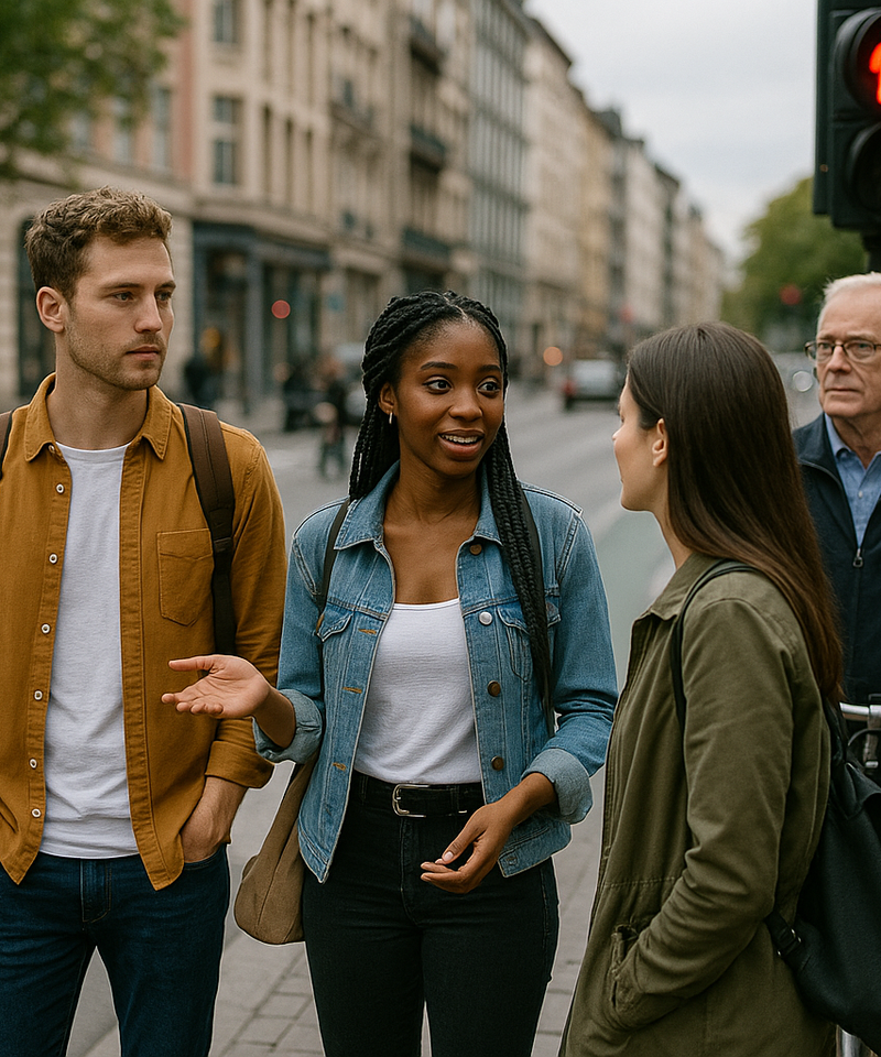 - Personen: Beschreibe genauer, wie die Menschen aussehen: Alter, Kleidung, Haltung, Gesichtsausdruck. („Ein junger Mann im Anzug sieht konzentriert aus.“)