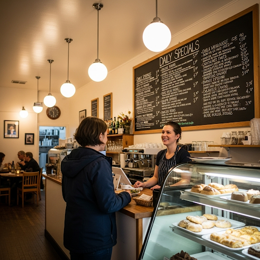 - Ort: Beschreibe den Ort ausführlicher. Drinnen oder draußen? Welche Details siehst du im Hintergrund? (z. B. Tische, Bäume, Verkehrsschilder)